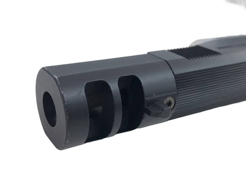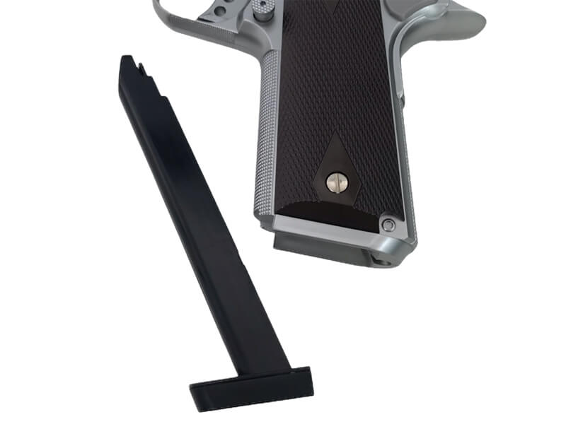 ハンドガンの場合は全体を金属性とする組み換え、エアソフトガンの場合は射出エネルギー0.98J以上にする改造を行うと銃刀法違反となります。HFC134a仕様のガスガンにCO2用マガジンを組み込む、スライドを金属製の物に差し替える等、簡易な改造でも罪に問われる可能性がございますので、絶対にお止めください。