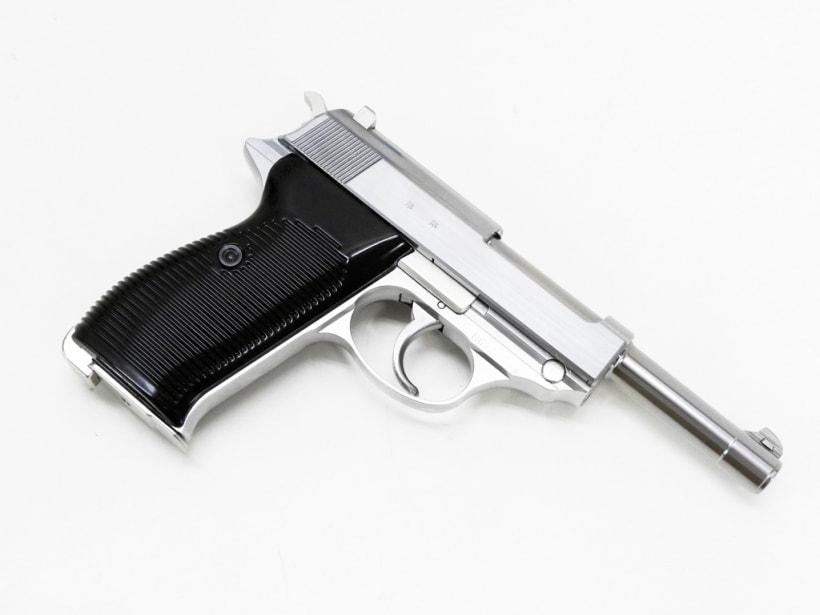 1938年にドイツ陸軍が制式採用した自動拳銃。第二次大戦直前までドイツ陸軍はルガーP08を制式拳銃として使用していたが、作りが精巧なため生産コストが高く過酷な環境で使うには耐久性に難があった。そこで安価で耐久性に優れた新型拳銃、ワルサー社のHP(HeeresPistolen)をP38として制式採用する。 最大の特徴はPPから継承したダブルアクション機構で大型軍用オートマチック拳銃としては世界初の試みだった。一般的なオートマチックと異なり左側に排莢されるが、一説には自動車(左ハンドル)を運転しながら左手を窓から出して撃てるようにするためと言われている。