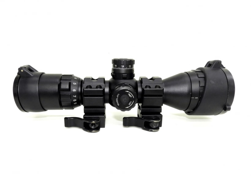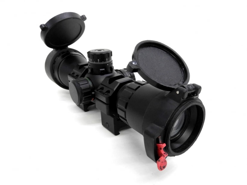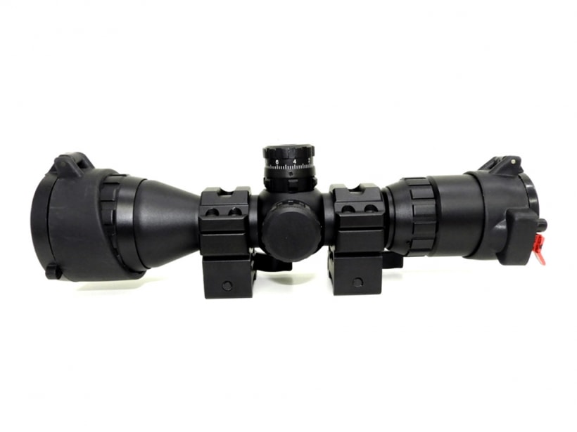 レティクルのカラー切替えと輝度調整が可能な高性能スコープ。20mmレイル対応。アルミ製マウントリング(チューブ径25mmのスコープに対応)が付属。