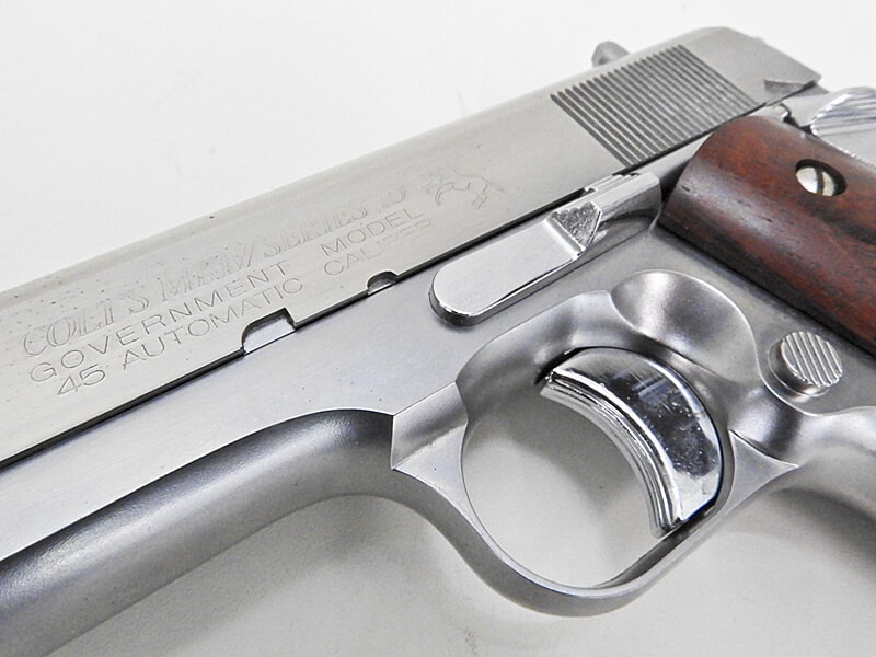 1987年、まだAGSKに加盟してたマルゼンの固定スライド式ガバメント。眩い仕上げのオールシルバーのボディに紫檀材のローズウッドスムースグリップが標準装備されている。