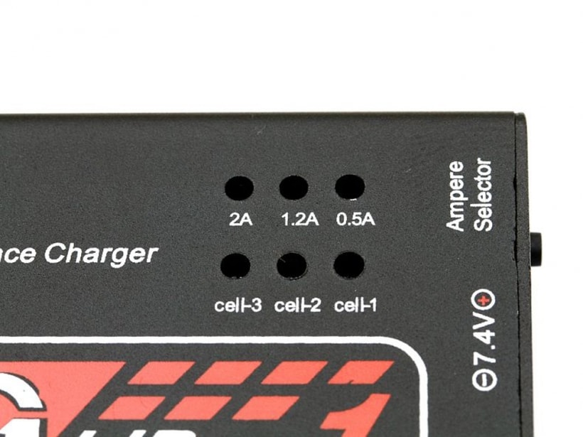 右サイドの「Ampere Selector」を押すたびに充電電流が変化します。充電するバッテリーに合わせて充電電流を設定し、バッテリーのバランスコネクターを本体に差し込むことで充電が始まります。