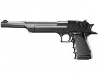 通常の倍以上に火薬量を増強した強装弾薬=マグナム弾は、従来は「ライフル用」もしくは「リボルバー用」として…が前提だった。しかし、M16などの軍用ライフルに見られるロータリー・ボルトの機構を応用する事によって、オートマチック・ハンドガンからマグナム弾を撃ち出す試みも、アメリカでは'70年代から盛んに行なわれてきた。“.44オートマグ”や“ウィルディ”などがその有名な例だが、多くは製造メイカーが弱小であったり、製品そのものが“試作品”の域を出ず、一部コレクターを喜ばせるに留まったのである。…たった一つの“例外”を除いては…!その“例外”こそ、かつて名銃“UZI‐SMG”を生んだ軍用銃の名門IMI(=イスラエル・ミリタリー・インダストリー/イスラエル軍兵器工廠)が開発したマグナムオート〈デザートイーグル〉だ。当初は“.357マグナム”のみだった口径も、1980年代中盤からアメリカでマグナムリサーチ社が製造&販売を手掛けるようになってからは、“.44マグナム”“.50AE(=口径50アクション・エクスプレス弾)”が加わって、計3種のバリエーションとなった。特にこの“.50AE”は、標的への打撃力に於いて“.357マグナム”のおよそ3倍!あの“.44マグナム”のおよそ2倍!! と圧倒的なパワーを有する、文字どおり『世界最高』クラスのハンドガンなのである。