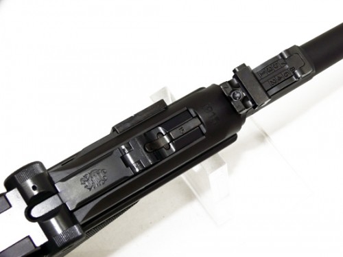 P08の最大の特徴であるトグルアクションもガスブローバックで見事に再現されている。ただ慣れていないと 通常のオートマチック拳銃のようにエイミングしていると、跳ね上がるトグルに驚くことは間違いない。