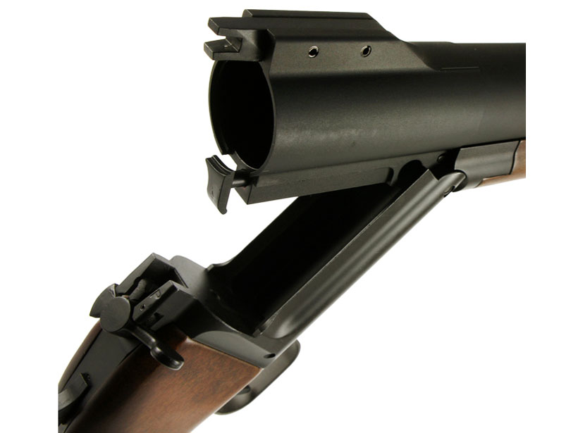King Armsが40mmガスカート仕様でモデルアップ! ストックは木製のものが標準装備され、渋めの雰囲気が魅力。削りだしで製作されたバレルには各部のステップ加工や内部のライフリングまでもが再現されている。
