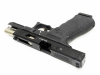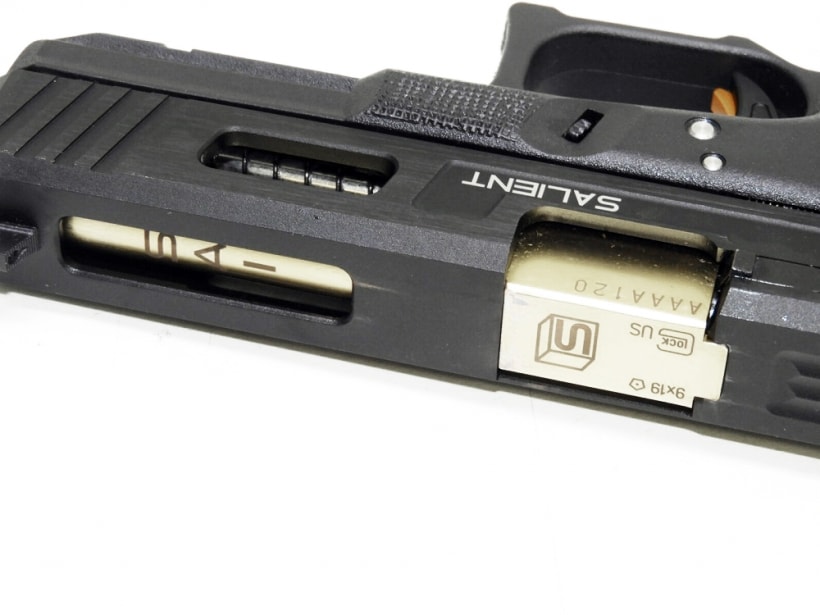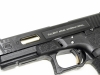 ステッピング加工のフレーム、大きく肉抜きされ、黒く光沢のあるスライド、フラットトリガー、ゴールドアウターバレル。スライドはクッキリとしたロゴと文字のレーザー刻印、深々と刻まれたセレーション。異彩を放つG17SAIカスタム登場。スライド、アウターバレルはもちろんメタル製。