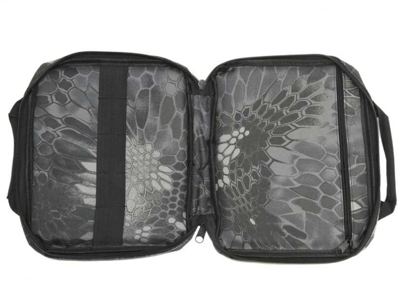 内部のファスナー部を開けていただくと、アクセサリーもしくは中型のハンドガン等を2丁収納していただく時に