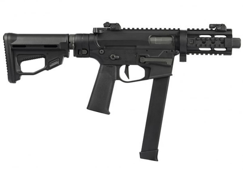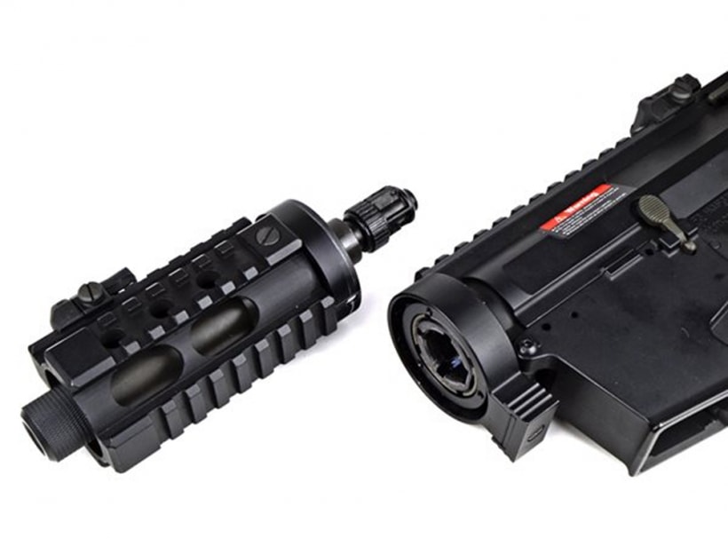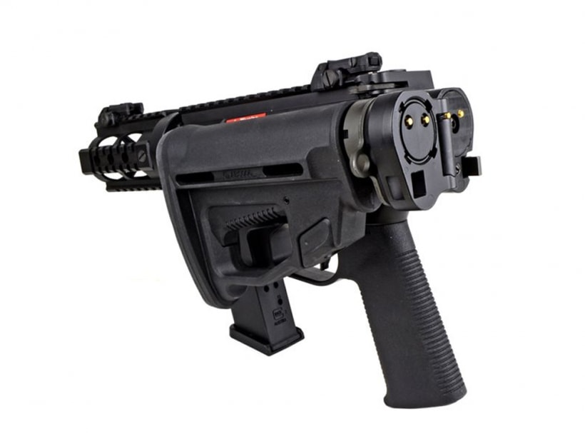 9mm仕様SMGとしての位置づけであるため汎用的なM4マガジンではなく専用マガジンを使用しますが、軽量・コンパクトさのメリットは非常に大きいです。