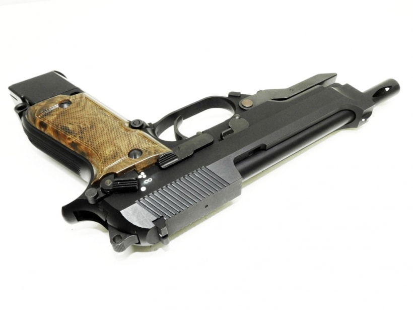 3点バースト発射の可能なM93R。 アウターバレルの溝が、ファーストバージョンは四角穴が6個。セカンドバージョンは横溝が3本になっている。
