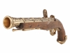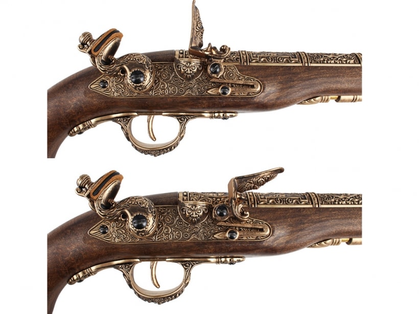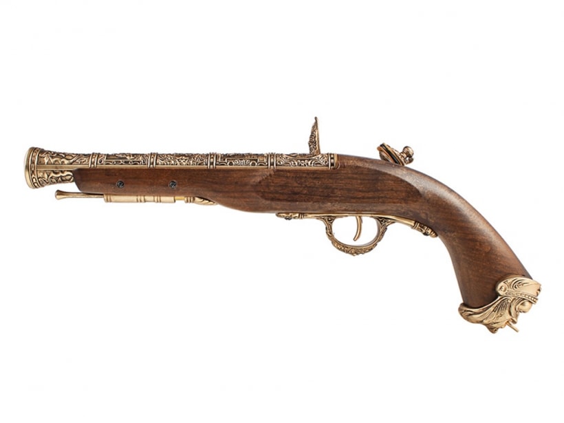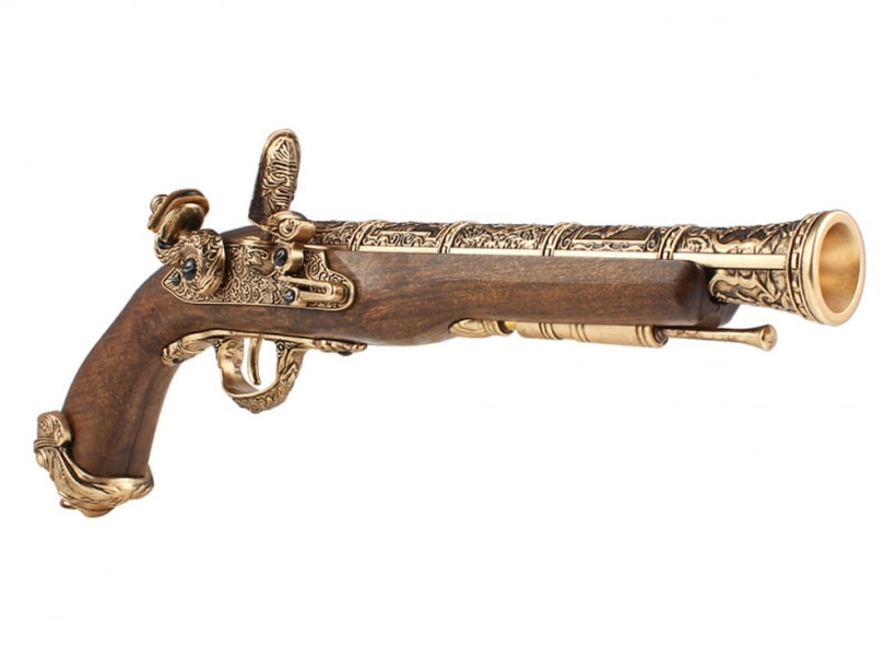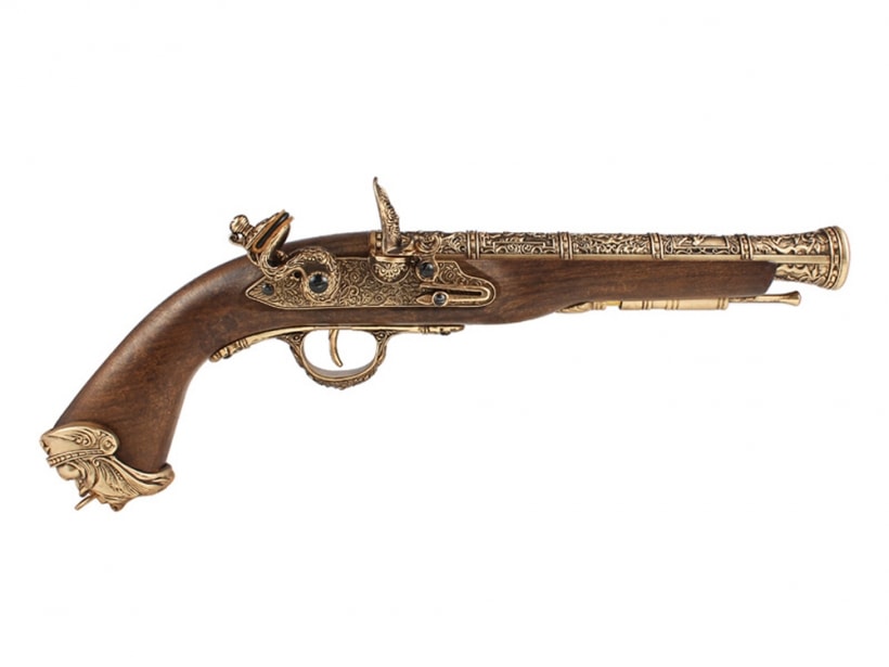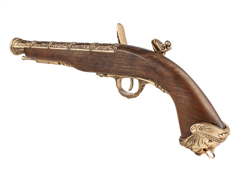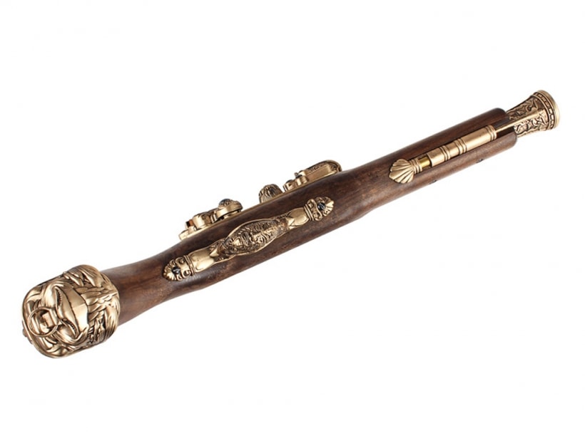 台湾HFCがフリントロックピストルをガスガンでモデルアップ。 ボディーには樹脂製のフェイクウッドが使用され、撃鉄やフリズン、バレル、 引き金周り、床尾など金属パーツの各所に海賊や当時をイメージした意匠が精巧に施されています。