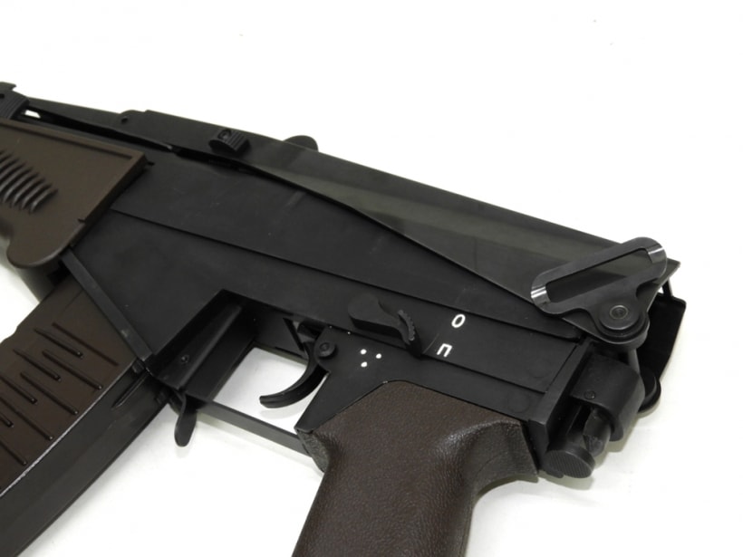 フォールディングストックとスタンダードなハンドガードでSR3Mの基礎となった銃。セレクターはセーフとオンがいわゆるAKタイプのセレクター部にあり、トリガー裏にセミとオートの切り替えセレクターをしっかりと再現しています。