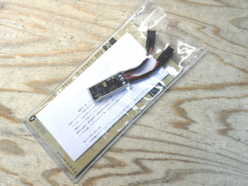 商品はパッケージ、本体、サイレンサー、マガジン4本(全てノーマルマガジン)のほか、UFCのバーストキットが付属。これはバッテリー端子につなぐだけでバースト発射が可能になる商品ですが、バーストになったりならなかったりで少し不安定です。