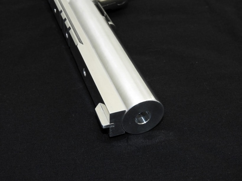 東京マルイのNEWパイソンをベースに、アルミ削り出しのヘビィアウターバレル、20mmマウントレイルを備えるキャロムショットのカスタムモデル。