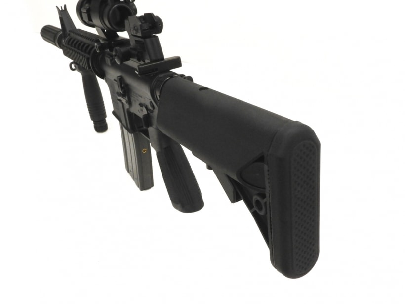 強化樹脂で製作されたアッパー&ロアレシーバーは、高剛性で信頼性も抜群。 ナンバリングが再現され、アルミ製ヒートシールドが内蔵されたアルミ製ハンドガードをはじめ、ハイグレードなカスタムパーツを搭載し、軍制式採用装備を完全再現しました。