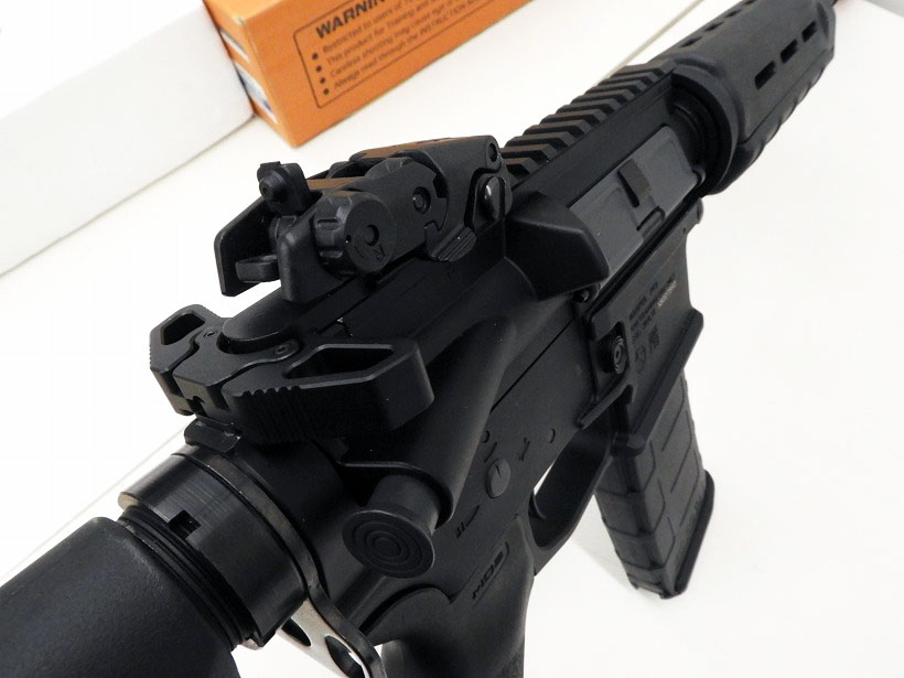 トリガーガードまで一体となった鋭角なデザインのカスタムロアレシーバーに、MAGPULの刻印がまぶしいM4コラボモデル。マガジンも近代装備の定番『PMAG30』をポリマー外装式で忠実に再現しており、さらに超軽量のバックアップ・リアサイトや、タフなデュポンナイロン製のMOEハンドガード・ストック・グリップを装備。