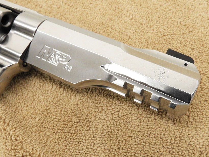 S&W社のファクトリーカスタム部門であるパフォーマンスセンターが、M27の8連発仕様・ピカティニーレイル装備、スカンジウム合金にて製作したカスタムモデル。光沢がきれいなステンレスモデル。