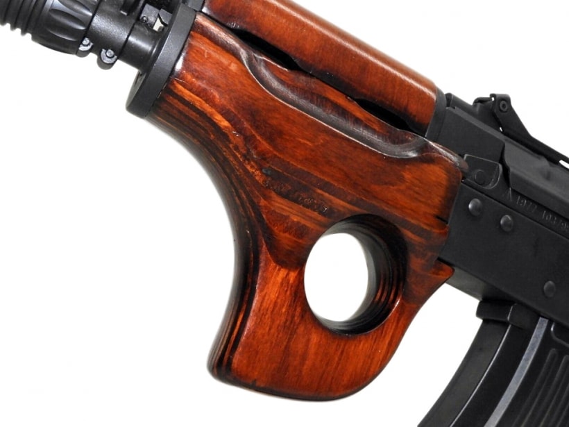 特徴的なサムホールハンドガードとフォールディングストックを装備した、機動性重視のショートタイプAK。
