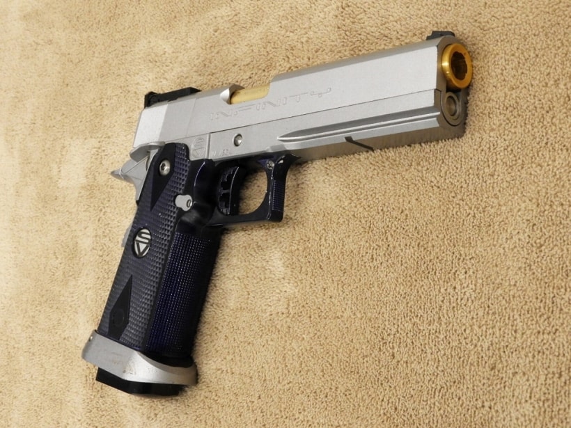 手に取るとさすがに1キロを超えてくる銃なので重さを感じる。大柄のマガジンウェルや交換可能な肉抜きトリガーシュー、マズル先端まで伸びたシャーシは存在感を引き立たせている。バレルはコーンバレルになっており、形は特徴的だ。また射撃性能はというとバルブロックシステムによりブローバックの最後の一押しまでガスを放出させるシステムを採用しブローバックの衝撃をもろに受ける。衝撃がきついのはマルイのデザートイーグル ハードキックなどが思い当たるが、こちらは重金属がそのまま衝撃を伝えてくるような感じなのでよりリアルな衝撃である。