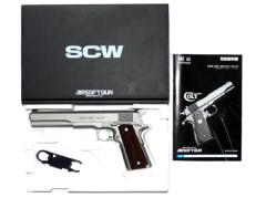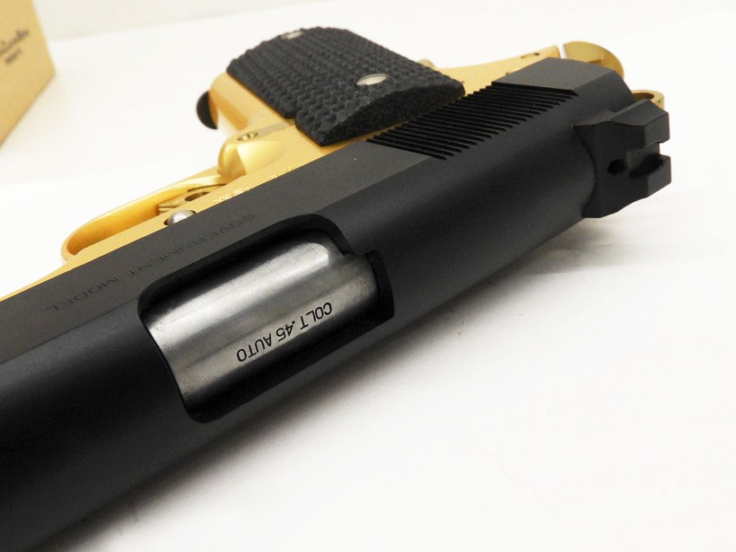 ベースモデルは、永遠の定番ガバメントの完成形シリーズ80=ハチマル。フレームアッセンブリーをゴージャスな夏色、ゴールドで纏められたのみならず、CQB(近接レンジ)仕様として、各部にカスタムパーツを装備。サム&グリップセフティが、操作しやすい大型のタイプに交換された他、リアサイトには懐かしのスナッグフリーサイトナイトアイを採用。ガンナーグリップを復刻&完全搭載。
