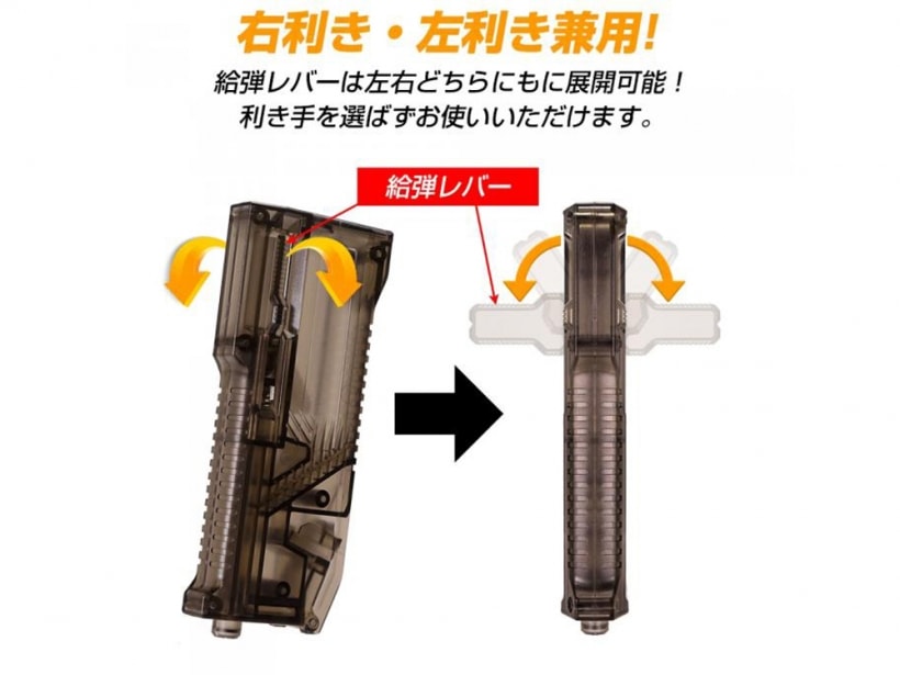 給弾レバーは左右どちらにもに展開可能!利き手を選ばずお使いいただけます。