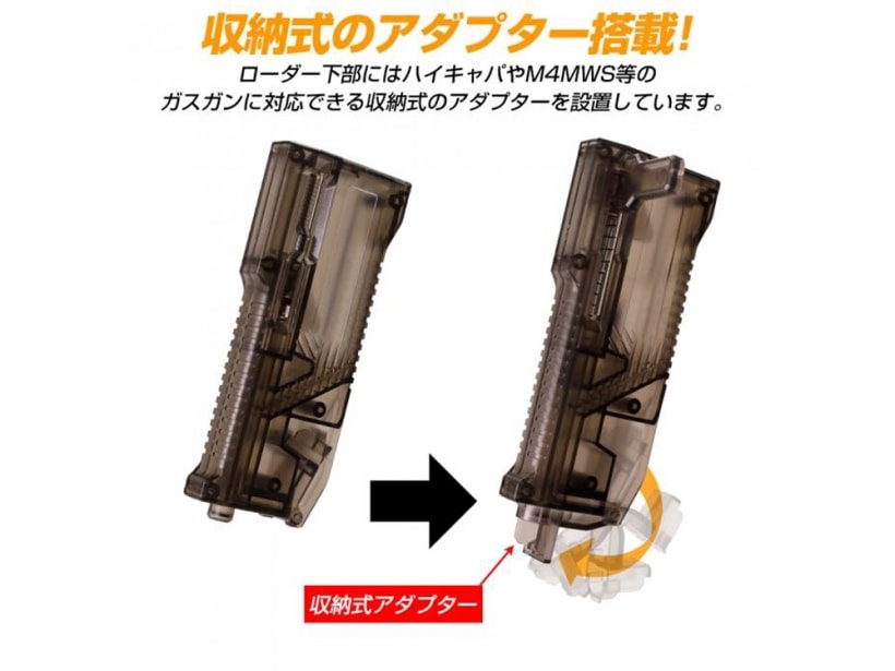 ローダー下部にはハイキャパやM4MWS等のガスガンに対応できる収納式のアダプターを設置しています。