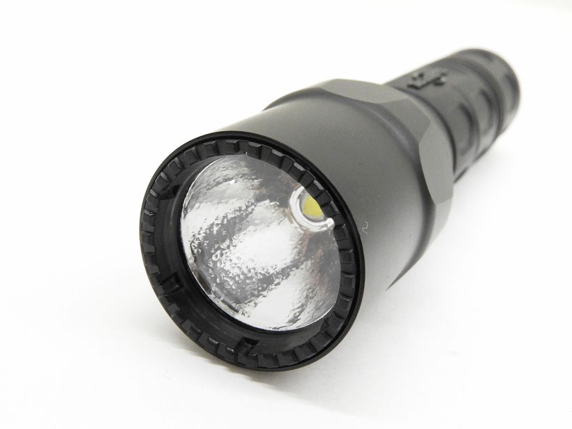 軽量なポリマー製筐体とアルミヘッドで構成されたフラッシュライト。