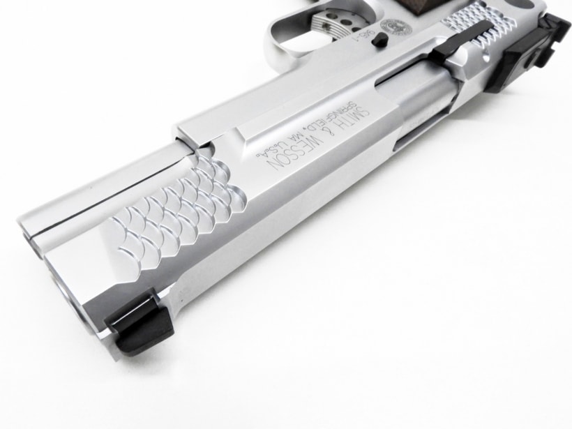 各種金属部品を焼結成型とすることで耐久性を格段にアップさせている。エアガンの心臓部であるピストンユニットは、過激なリコイルショックを叩き出すハードキック型エクセレント仕様となっており、ガツンとくるブローバックを楽しめる。うろこ状のセレーションはとてもきれいで、観賞用としても十分通用するモデルだ。スライドの刻印もレーザー刻印で非常に綺麗。