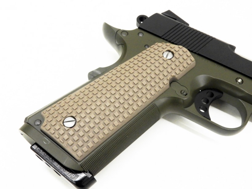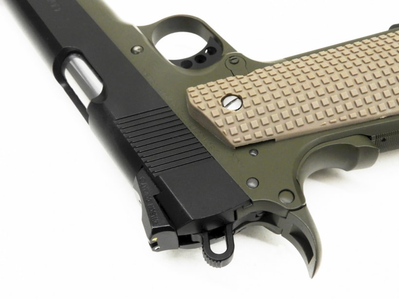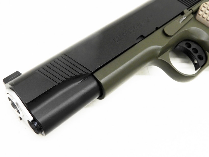 実銃では4種類のカラーオプションが存在する「ウイルソン・コンバットCQB」。その内のひとつ、ブラック/OD(オリーブドラブ)の2トーンという独特のカラーリングのモデル。