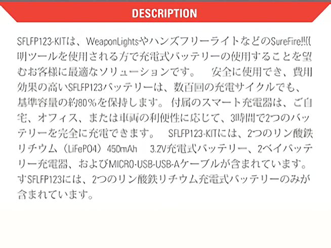 [SUREFIRE] SFLFP123-KIT チャージャー バッテリー二本セット (新品) 製品詳細画像2