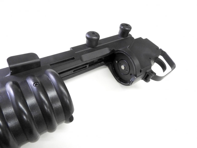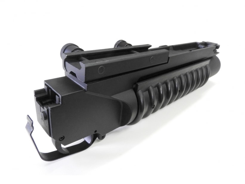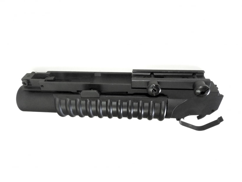 約20mm幅のマウントレイルに対応した、40mmカートリッジ対応グレネードランチャーです。M4カービンの10.5インチクラスショートバレルの下部に収まるショートサイズになっています。