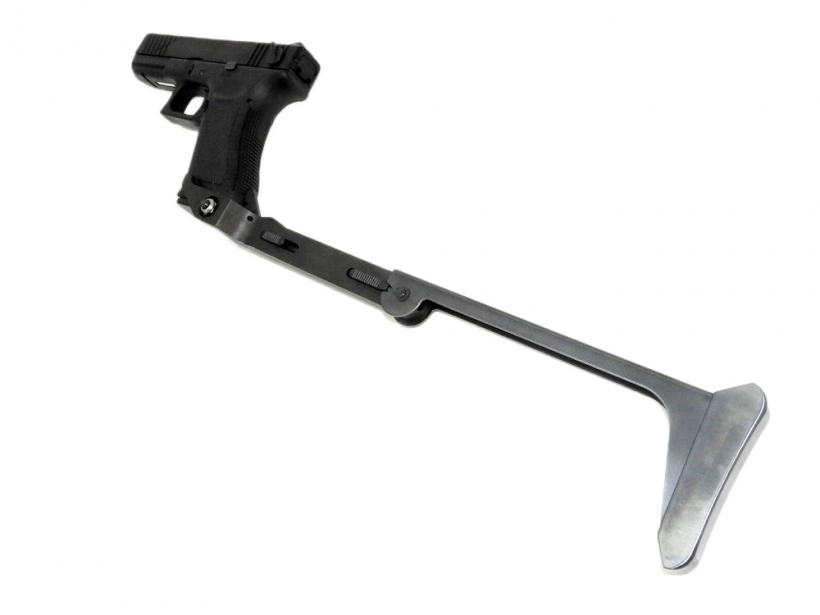 さらに、構えた時の安定感を高めるため、実銃での流用例も多い「M93R用フォールディングストック」を標準装備。アタッチメント部はランヤード金具風なのでピストル状態でも違和感なく、カスタムスライドによってストックを構えたままでもスムーズな操作が可能です。