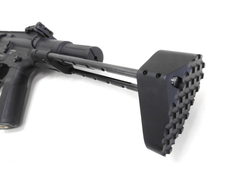 バッテリーが収納できるリトラクタブルストック。ワイヤーストックながら基部が金属製となっていて、非常に安定している。バットプレートが金属製で、滑り止めの彫込みも深くかなりの完成度を誇る。