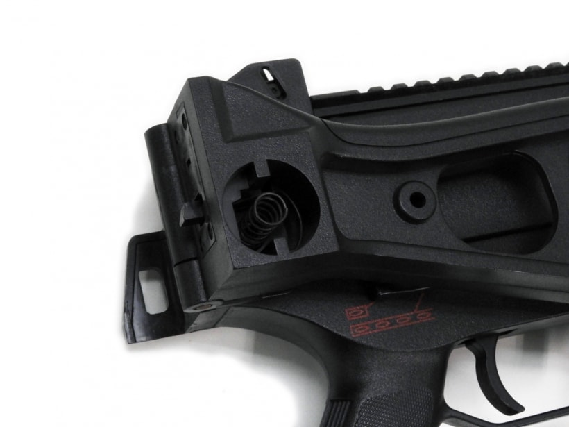 折り畳みストックのロックボタンが失われているため固定できず、