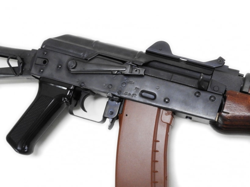 AK47の後継モデルとして開発されたAK74。5.45×39mmという小口径になり、AK47の弱点であるフルオート時のコントロール性を向上。大型化されたフラッシュハイダーが特徴的。AKS74U(愛称:クリンコフ)は、銃身まで切り詰めたCQBモデルで、狭い場所でも取り扱いが容易。AKS-74UNの「N」は「ナイトビジョン対応」ということでサイドレール付きのバージョンをモデルアップ。