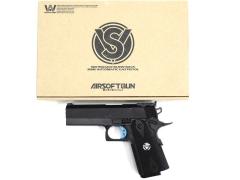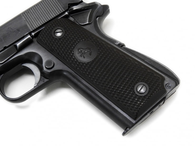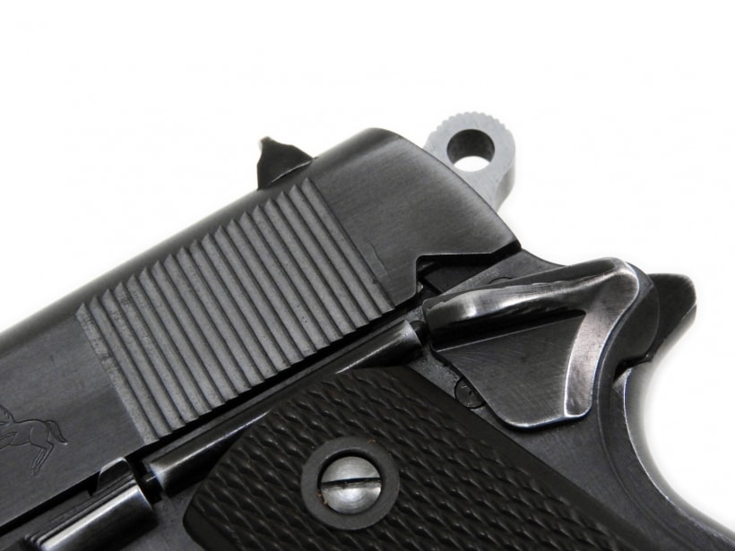 操作性の高いリングハンマーや、それにあわせて短く形状変更されたグリップセフティ、そして、ランパンコルトが中央に配置された樹脂製グリップといった、コマンダーモデルならではのディティールを精密に再現しました。もちろん、スライド後方には、大型のピストンを持ったブローバックユニットが内蔵されておりますので、迫力のブローバック?作動と、正確なシューティングをおたのしみいただけます。