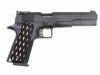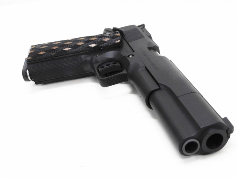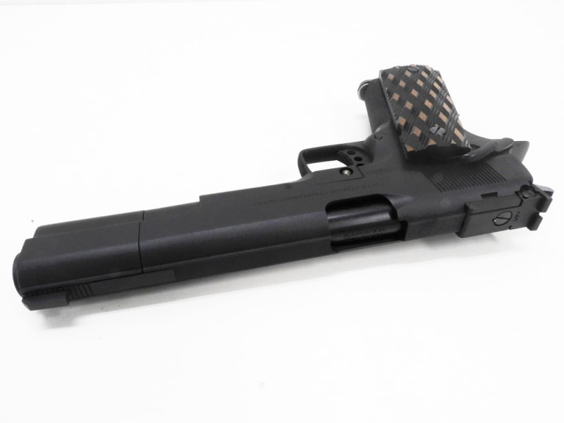 ガスポートのないコンペンセイターやプレートの入ったダイヤカットグリップなどが特徴的なレースガン。もちろんグリップセーフティーはオミットされています。