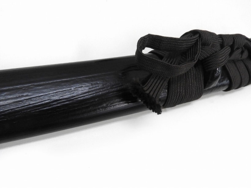 荒塗り漆風の鞘、黒柄に茶色の柄糸をあしらったシックな雰囲気の模造刀。