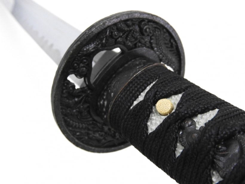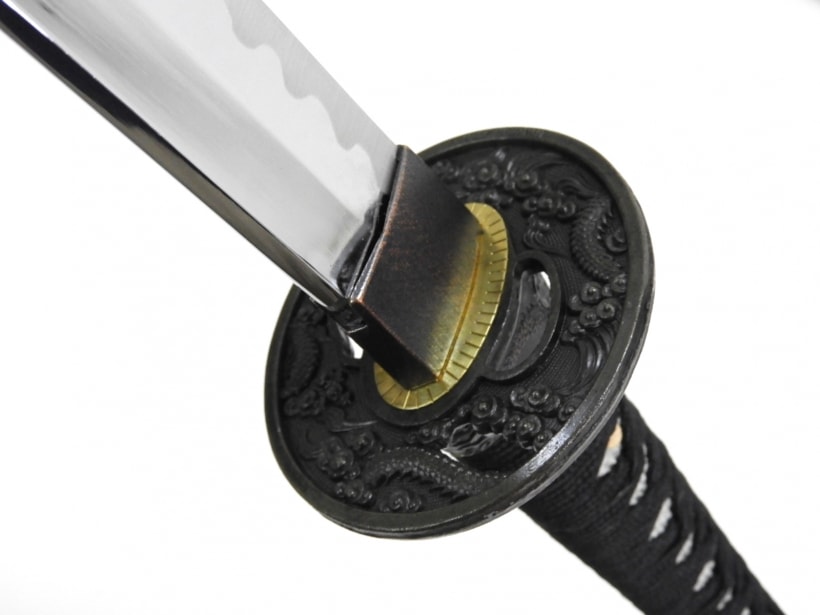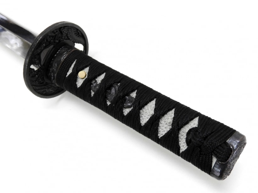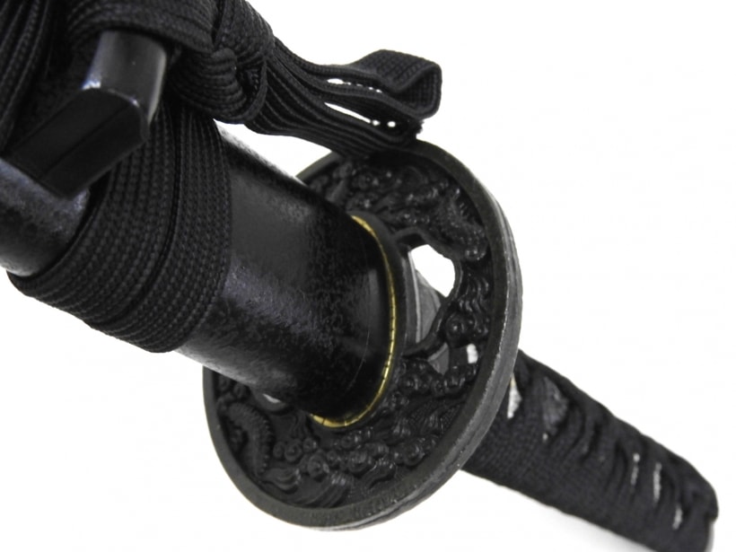 黒石目の鞘に黒の柄糸と全く同意匠の太刀と脇差のセット。太刀は鯉口ゆるめで抜けやすくなっています。