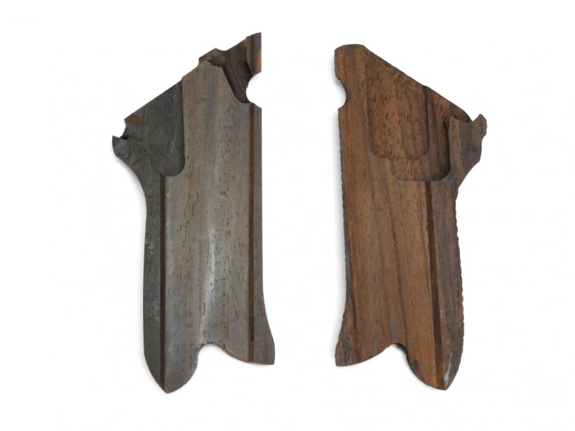 ルガーP08用フルチェッカー木製グリップ。左右でかなり色味が違う。