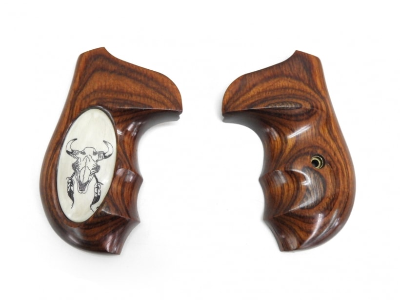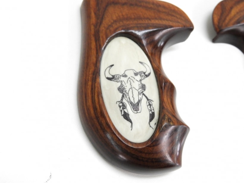 バッファローの頭蓋骨のインレイパネルが埋め込まれた木製グリップパネル。S&W Jフレーム用、ラウンドバット、オーバーサイズ、フィンガーチャンネルあり。