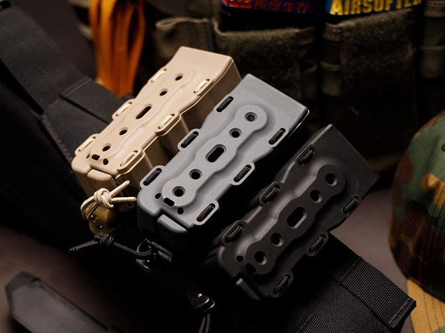 素早いマガジンチェンジが行えるハンドガン用の樹脂製マガジンホルダーです。残弾のあるマガジンをマガジンホルダーに戻す場合(タクティカルリロード)に最高のパフォーマンスを発揮! 各種ホルスターと共通規格の取付穴を設けているため、お好みに合わせたキャリングシステムを構築することができる、優れたドロースピードと拡張性を備えたアイテムです。