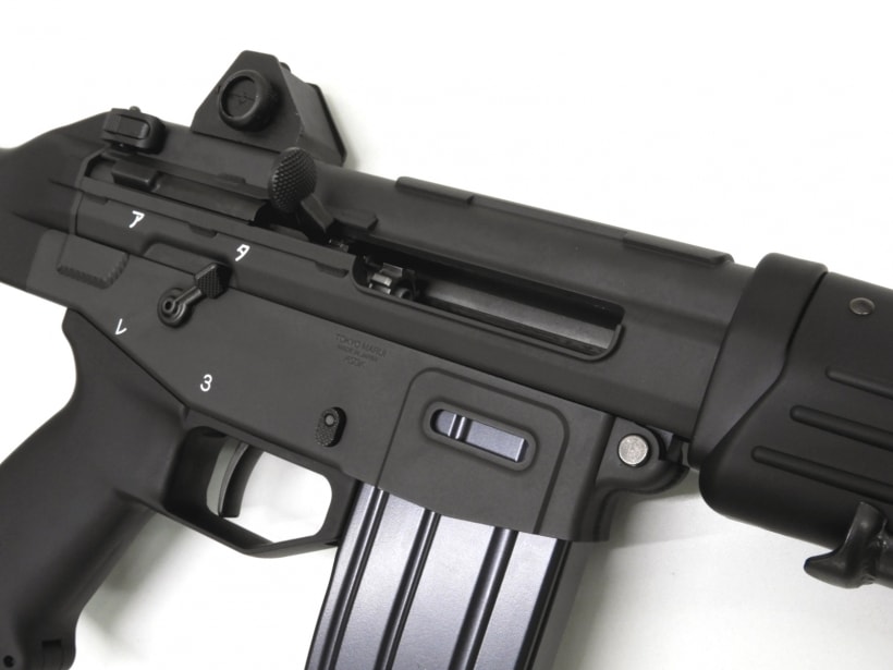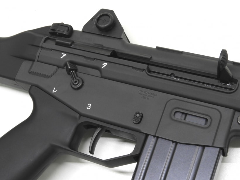 東京マルイのガスブローバックでは初となる「3バーストメカ」を搭載し、現行型の刻印や左面セレクターレバーを採用。本物と同様に金属製と樹脂製のパーツを使い分け、手にした際の重量感や、質感の違いも楽しめます。