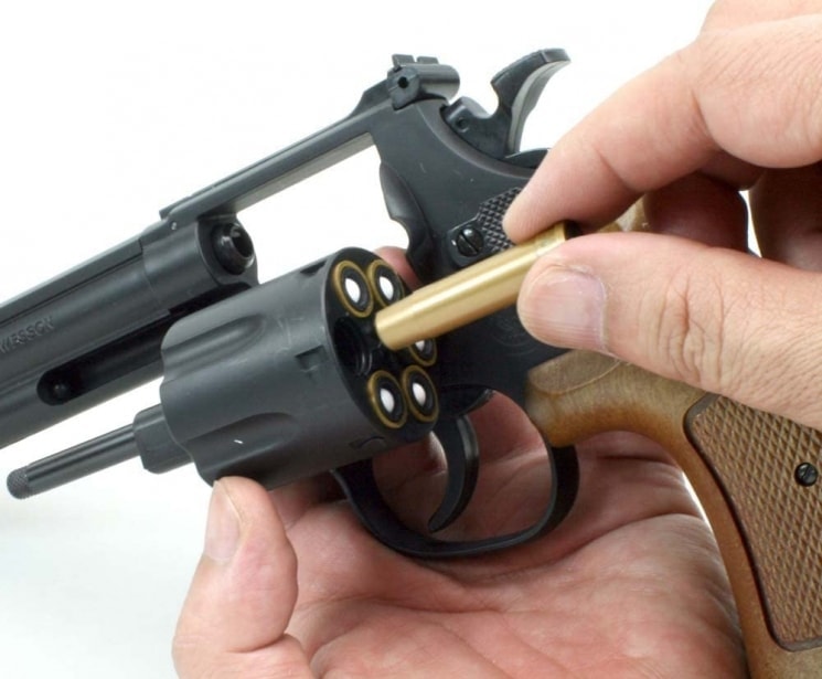 クラウンモデル製 S&W M586 エアコッキングガン。リアルなスイングアクションが可能。カートリッジにBB弾を装填し、シリンダーにカートリッジを装填し発射する。