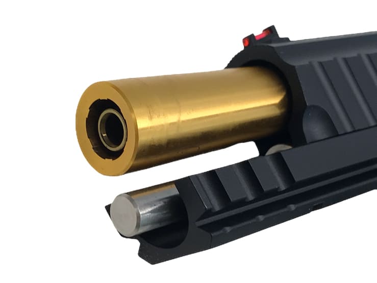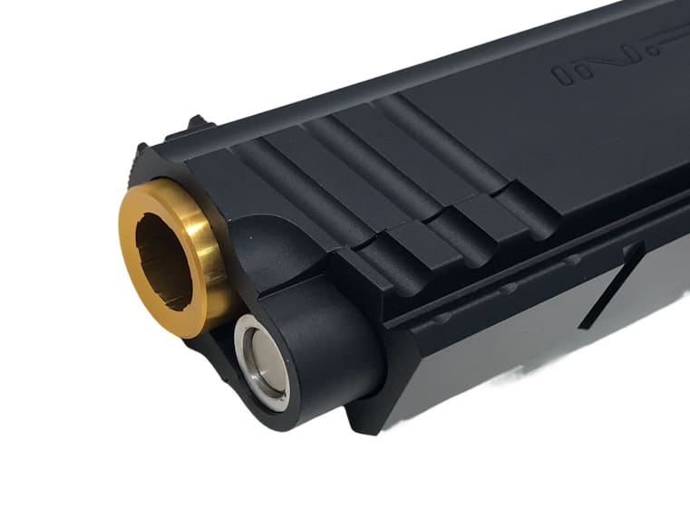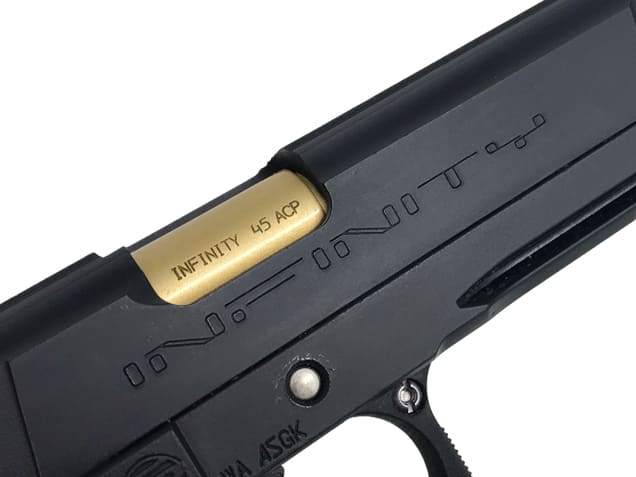 マシン加工で大胆に削り取られたスライドやシャーシ、集光式フロントサイト、ブロンズカラーのバレルなどなど、美しい外観。さらにステンレスハンマーを搭載している。