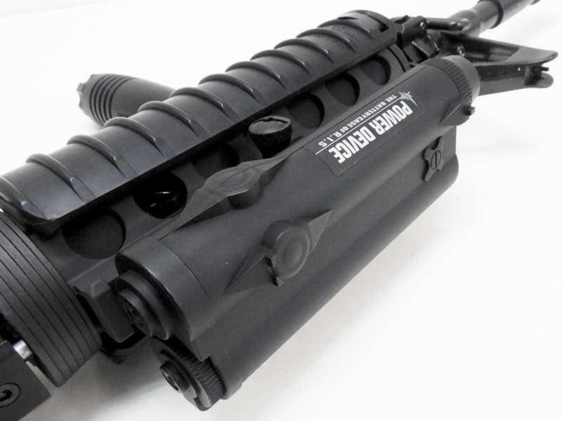 アメリカの特殊部隊向け装備を開発、製造しているナイツ・アーマメント社の正式認可を受けて再現されたアルミダイカスト製のR.I.S(レール・インターフェース・システム)に、バーチカル・フォアグリップとハンドガードパネル、レーザーサイト型バッテリーケースを搭載した東京マルイのM4A1 R.I.Sバージョンに、同じく東京マルイから発売されているナイツ社の「黒騎士」ことSR-16のフレームを組み込んだカスタム品。