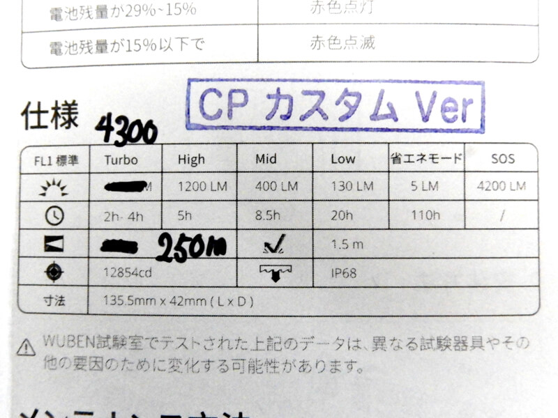 [WUBEN]フラッシュライトCUPOLA A21 CPカスタム Ver 4300lm (中古) 製品詳細画像4 説明書が手書きで修正されているのはご愛嬌か。