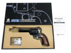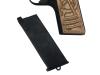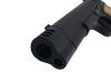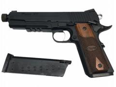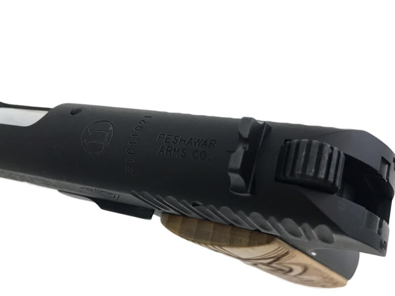 プレーンウッドに焼印されたような風合いがユニークな木製グリップをはじめ、近代的な「セーフトリガー」やアルミ合金製コンプ、クロームメッキ仕様のアウターバレルなどをフル装備し、さらにコンプ無しのスタイルや旧型マグベースへの変更も可能な豪華版です。