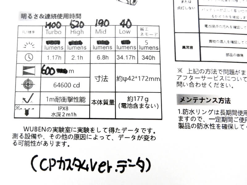 [WUBEN]T103 CPカスタム ブラック フラッシュライト 1400lm (中古) 製品詳細画像5 説明書の手書き修正は、CUPOLAさんでの販売時のものとの事。