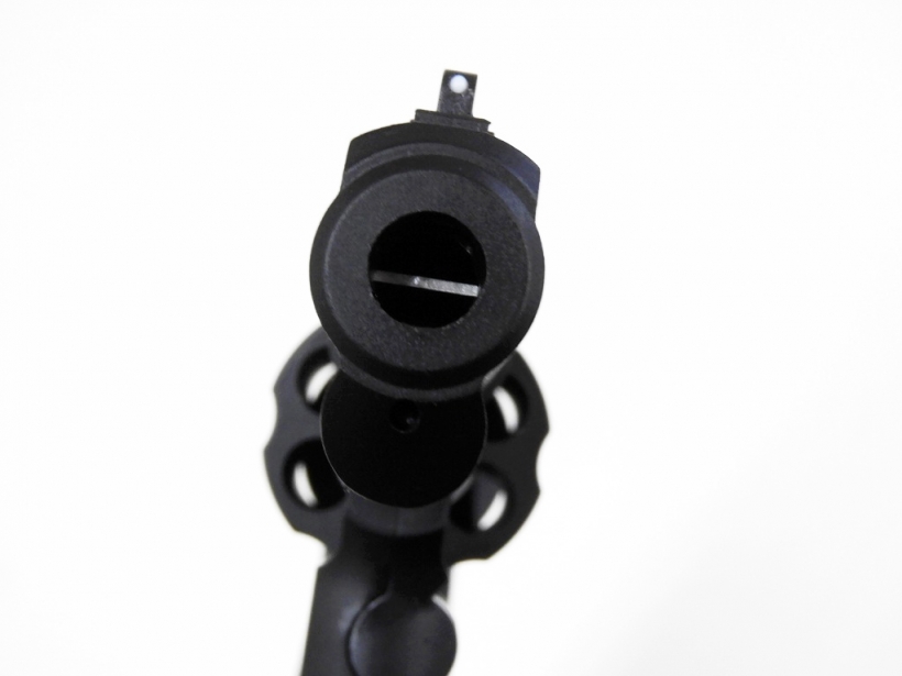 トリチウムドットをイメージしたフロントサイトに、ブラックブレードタイプのアジャスタブルリアサイト、スピードローダー対応のカットダウン