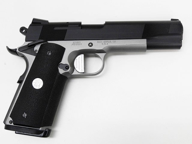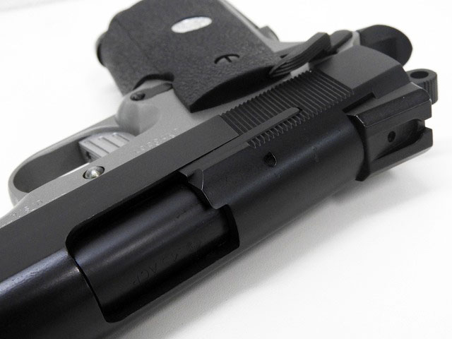 SW1911セミカスタム品。DKのシルバーフレーム、スライドはSW1911ブラックモデル。SWメダリオンラバーグリップなど。また発射時にフルオート仕様となっています。