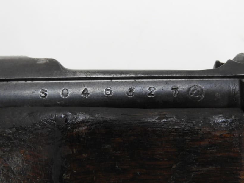本品の機関部左側面にはシリアルNo.5046327の刻印が入っています。 薬室上面には「三八式」の刻印がはっきりと残っています。